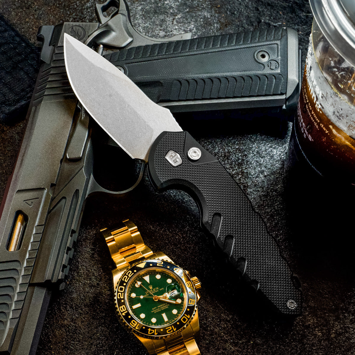 The Americana is our first Wharncliffe blade. Named after the Jiu Jitsu submission shoulder lock. Opposite of our Kimura, the wharncliffe design is extremely pointy and has a pure straight cutting edge, following the tip. This knife is designed for the individual that needs a little bit more than a discreet carry knife. Still easy to conceal, this handle configuration offers a more fulfilling grip.